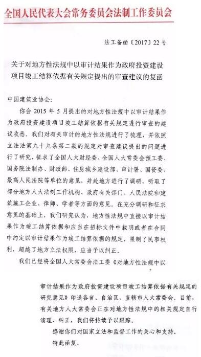 全國人大常委會法工委日前在回復(fù)中國建筑業(yè)協(xié)會《關(guān)于對地方性法規(guī)中以審計結(jié)果作為政府投資建設(shè)項目竣工結(jié)算依據(jù)有關(guān)規(guī)定提出的審查建議的復(fù)函》中提出,地方性法規(guī)中直接以審計結(jié)果作為竣工結(jié)算依據(jù)和應(yīng)當在招標文件中載明或者在合同中約定以審計結(jié)果作為竣工結(jié)算依據(jù)的規(guī)定,限制了民事權(quán)利,超越了地方立法權(quán)限,應(yīng)當予以糾正。且法工委已將研究意見印送各省、自治區(qū)、直轄市人大常委會。目前,有關(guān)地方人大常委會正在對地方性法規(guī)中的相關(guān)規(guī)定自行清理、糾正。